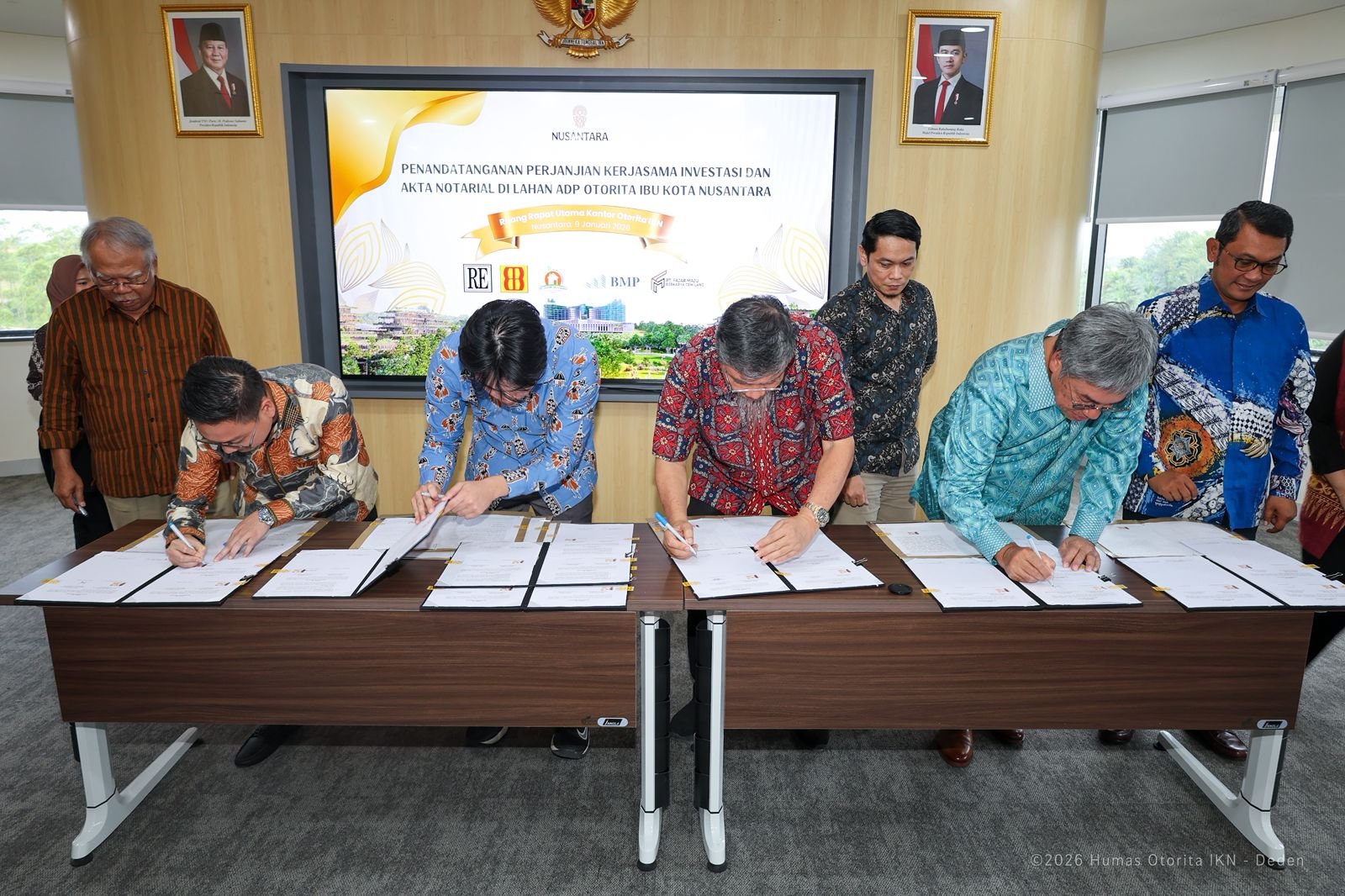 NUSANTARA — Kepala Otorita Ibu Kota Nusantara (IKN), Basuki Hadimuljono, secara resmi menandatangani Perjanjian Pemanfaatan Tanah dan Pengalokasian Lahan Aset Dalam Penguasaan (ADP) Otorita IKN bersama lima investor, disertai penandatanganan akta notarial, di Kantor Balai Kota Otorita IKN, Kawasan Inti Pusat Pemerintahan (KIPP) Nusantara, Jumat (9/1/2026).